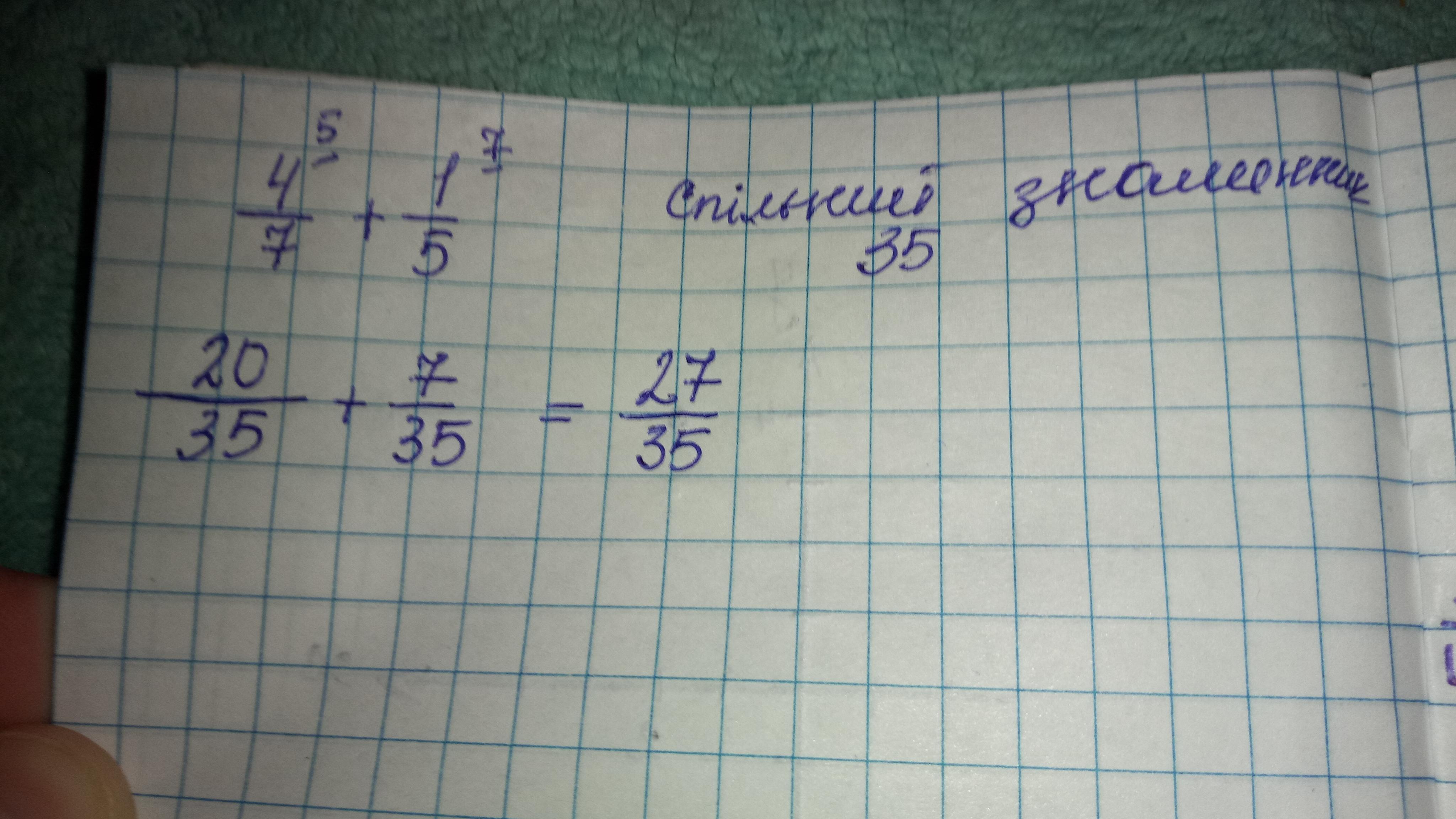 Відповідь: Зводимо до спільного знаменника, спільний знаменник 35. Тоді домножаємо перший дріб на 5, другий дріб на 7.