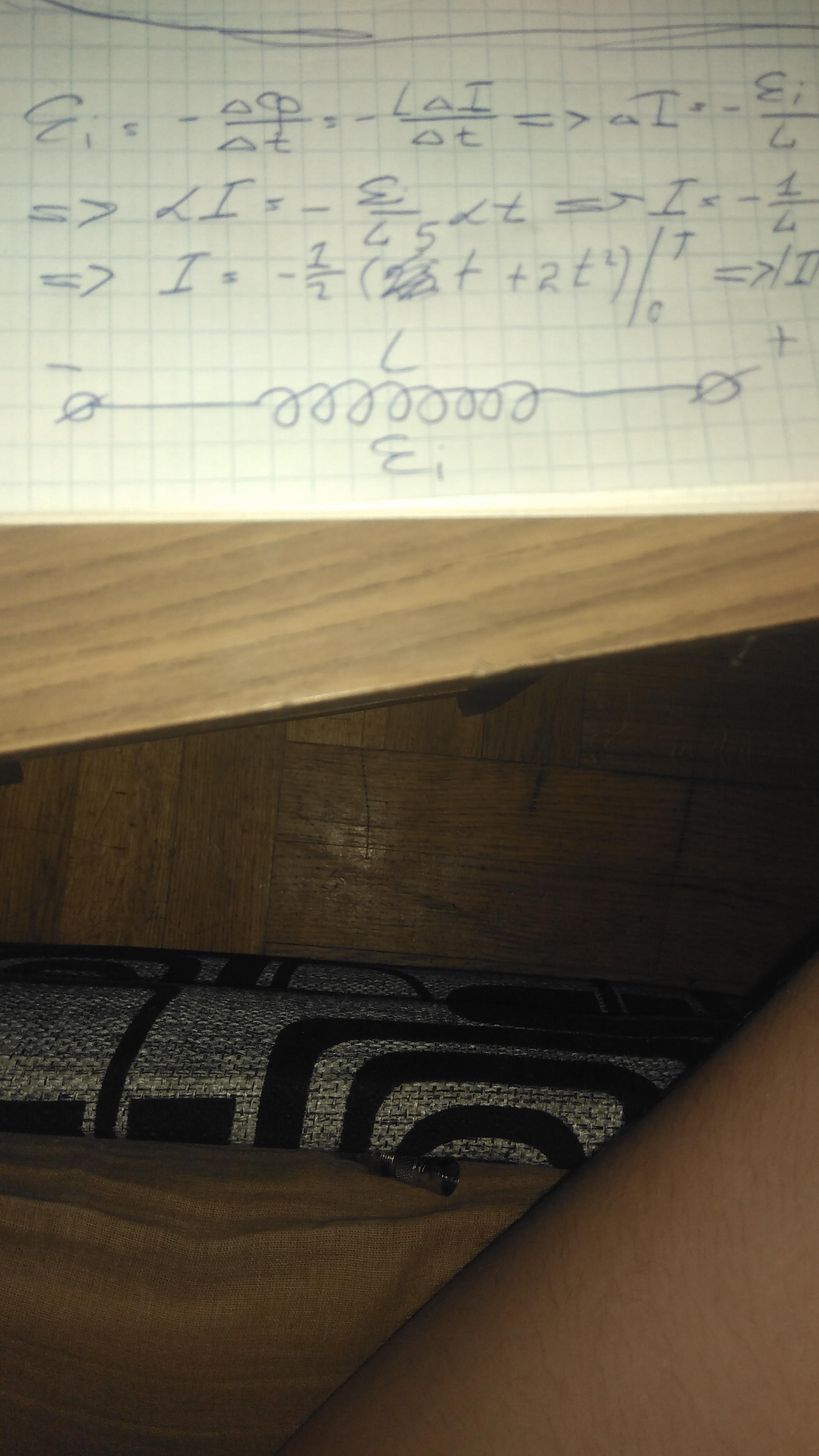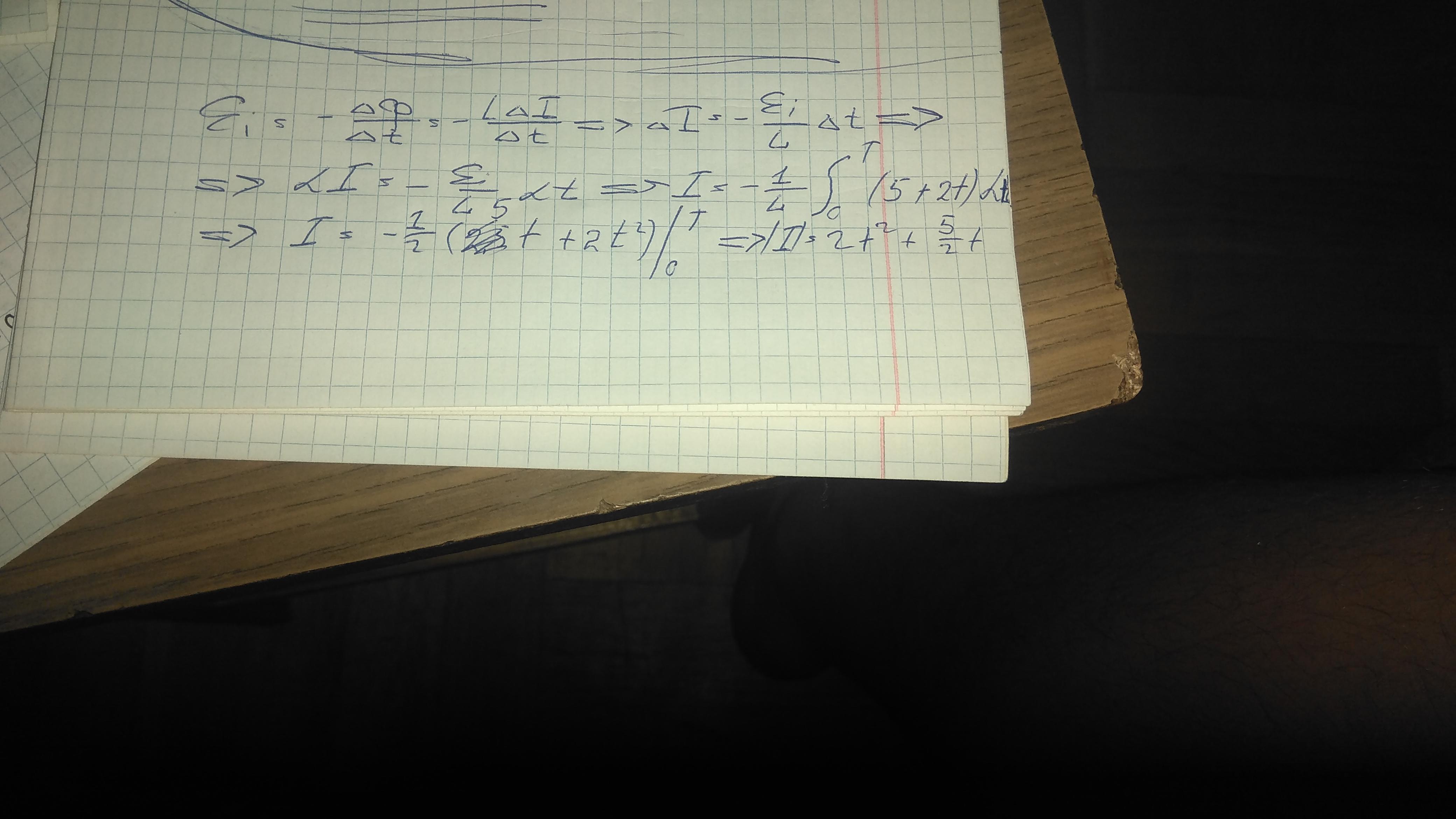 ЭДС самоиндукции возникающая в цепи индуктивностью L=2 Гн изменяется с течением времени по закону ЭДС=(5+2t)В. По какому закону изменяется I(t) в цепи. Вот мои наброски и моего друга.
