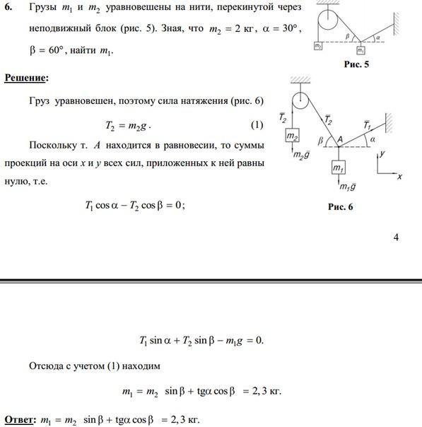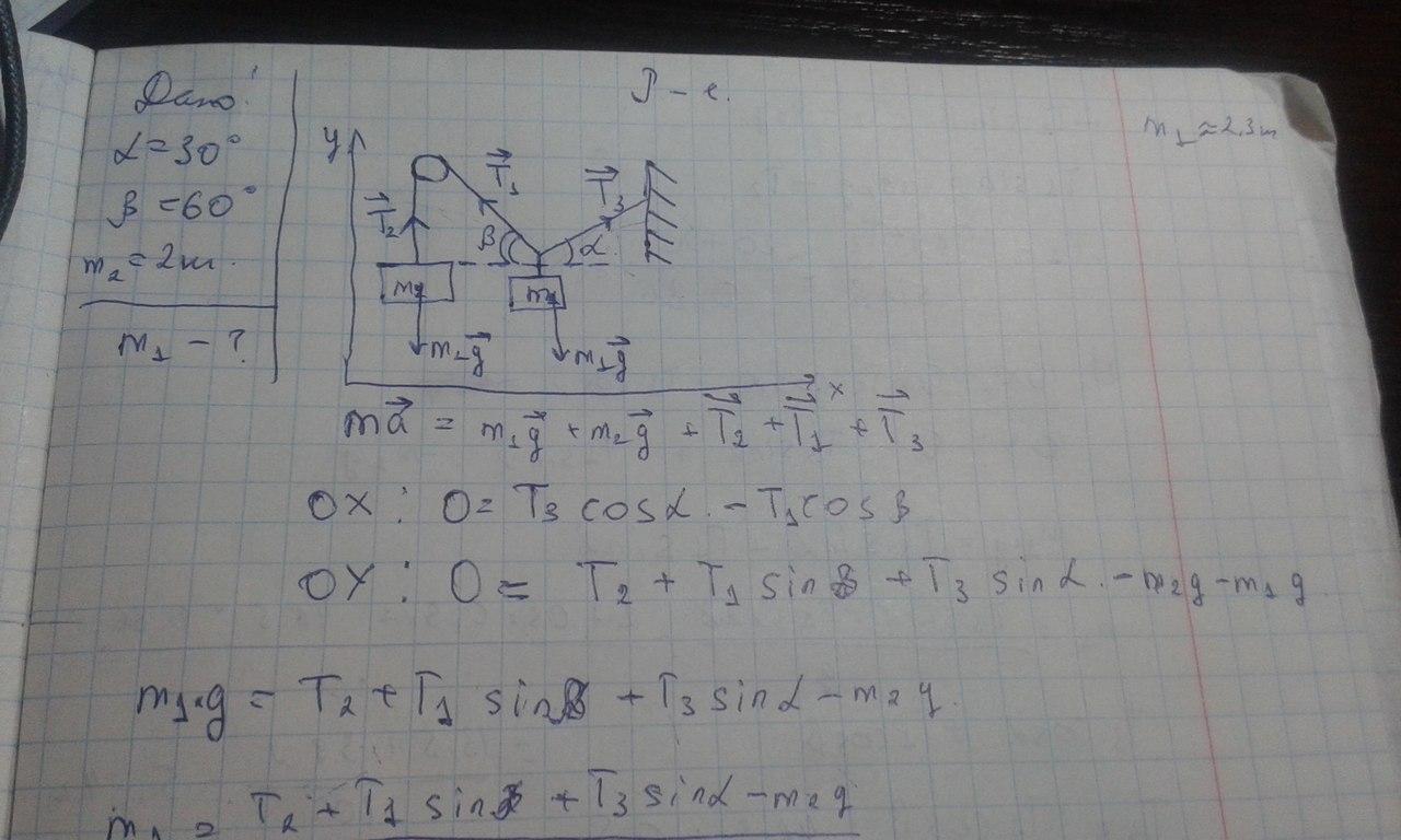 Грузы m1 и m2 висят на нити, перекинутой через неподвижный блок. В равновесии: a=30градусов , В=60 градусов. Зная, что m2= 2 кг найти m1