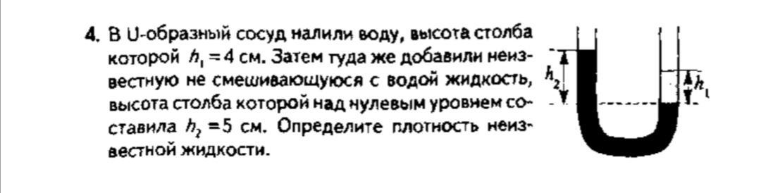 p2 = p1h1/h2 = 1000кг/м^3*4см/5см = 800кг/м^3
