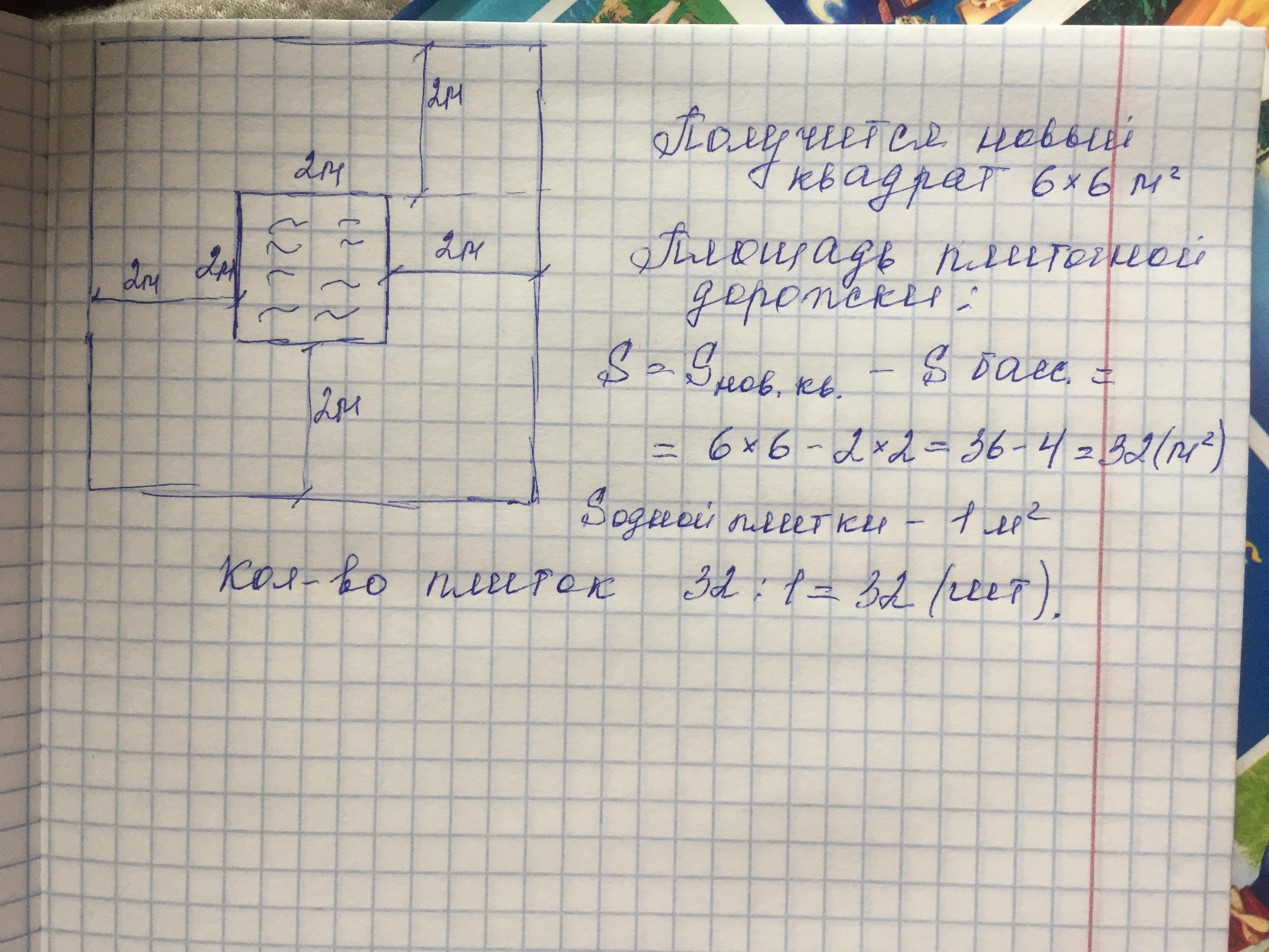 Вокруг бассейна квадратной формы со стороной 2 м проложена дорожка шириной 2 метра. Дорожка выложена плиткой площадью 1 m квадрат каждая. Сколько плиток потребовалось?
