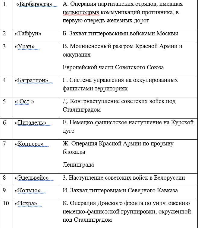 Соотнесите кодовые названия военных планов советского и германского командования их содержание