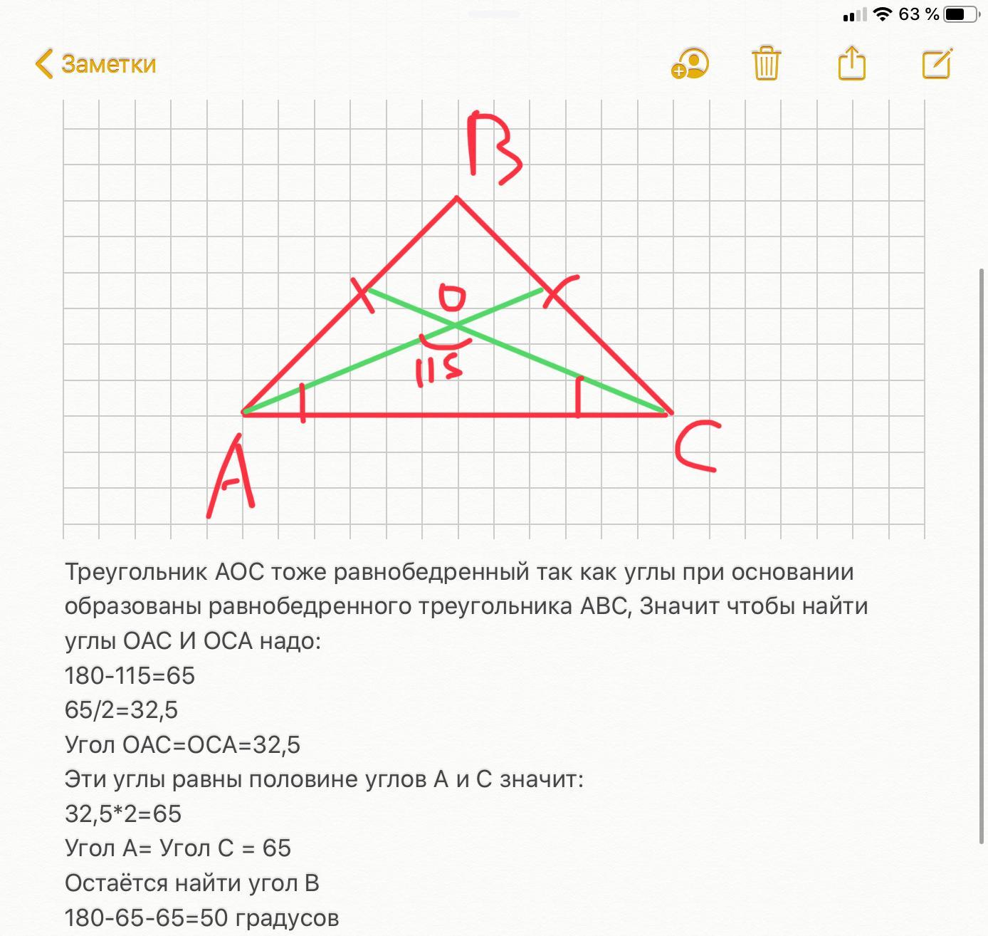 В равнобедренном треугольнике ABC с основанием AC биссектрисы углов при основании пересекаются в точке O. Найдите градусную меру угла B, если угол AOC=115 градусов