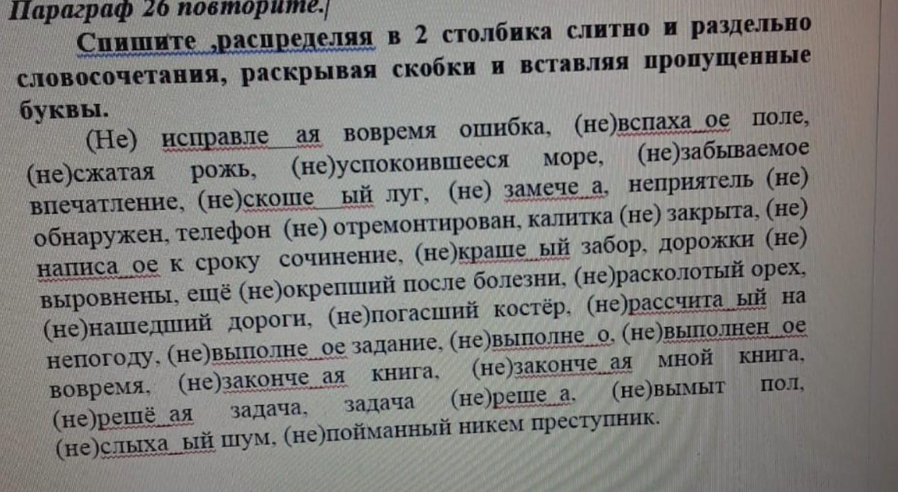 неуспокоившееся море, незабываемое впечатление, нескошенный луг, ненаписанное к сроку сочинение, некрашенный забор, еще неокрепший после болезни, нерасколотый орех, ненашедший дороги, непогасший костер, нерассчитанный на непогоду, невыполненное задание, невыполненное вовремя, незаконченная мной книга, нерешенная задача, неслыханный шум, непойманный никем преступник.