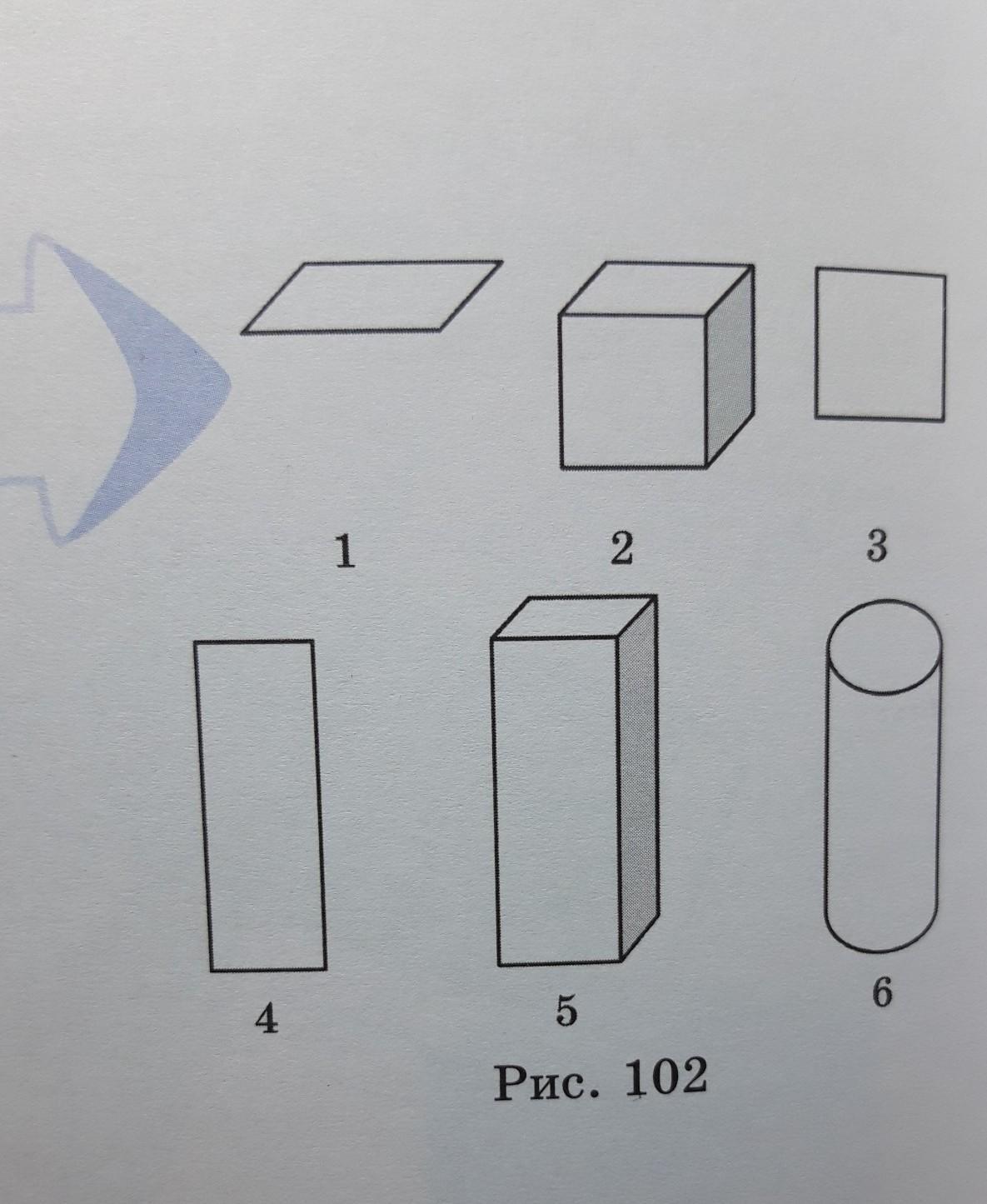 Назовите номера геометрических фигур, пространственных фигур ,плоских фигур изображённых на рисунке 102