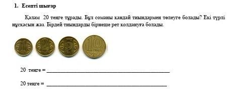 Калам 20тенге тұрады Бул соманы қандай тиындармен төлеуге болады? Екі түрлі нұсқасын жаз.Бірдей тиындарды бірнеше рет қолдануга болады