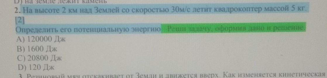 на высоте 2 км над землей со скоростью 30 м/с летит квадрокоптер массой 5 кг.