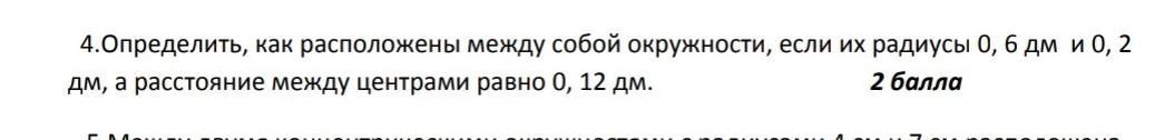 4.Oпределить, как расположены между собой окружности, если их радиусьы 0, 6 дм и 0, 2 дм, расстояние между центрами равно 0, 12 дм. Сделать рисунок