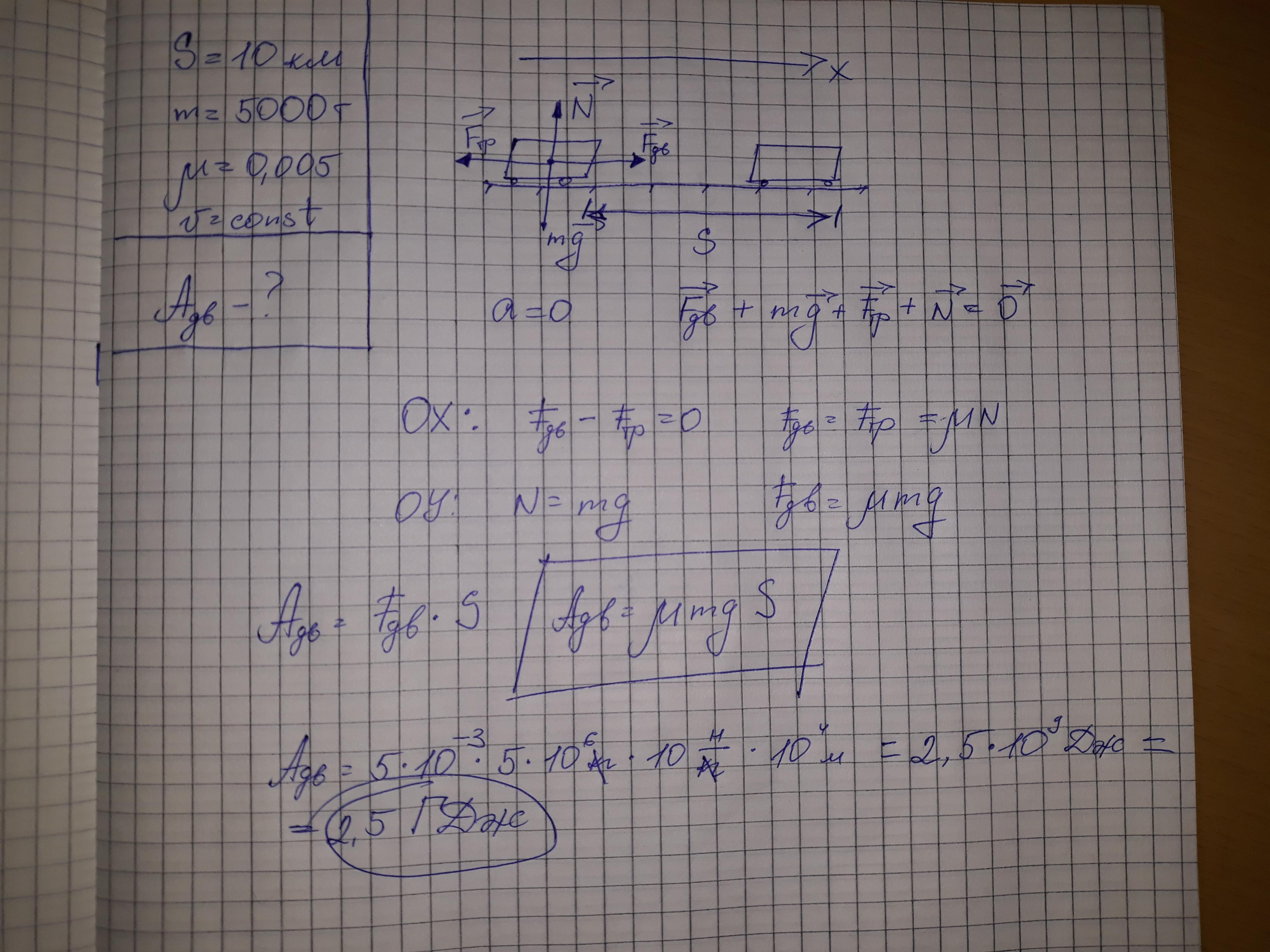 Электровоз движется равномерно и проходит путь 10 км. Какая работа совершается при этом, если масса состава 5000 т, а коэффицент трения колёс о рельсы 0,005?