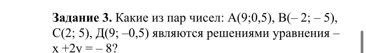 Задание 3. Какие из пар чисел: А(9;0,5), В(– 2; – 5), С(2; 5), Д(9; –0,5) являются решениями уравнения – х +2у = – 8?
