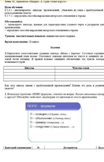 сор по литературе 8 класс 4 четверть раздел Мцыри​