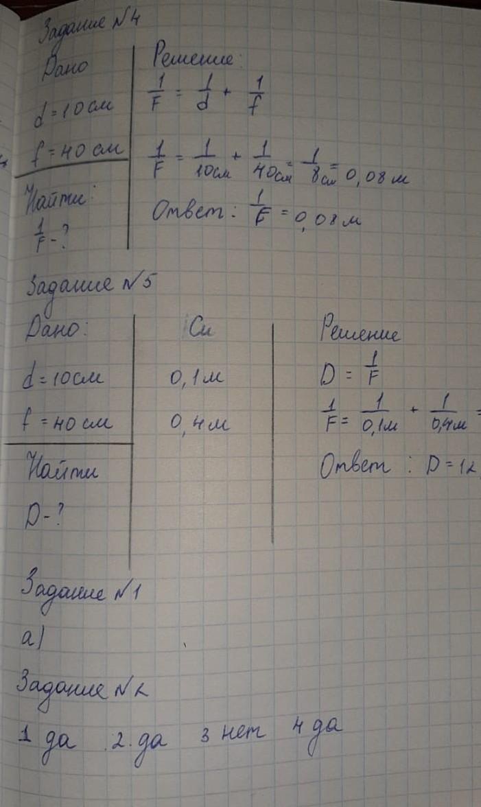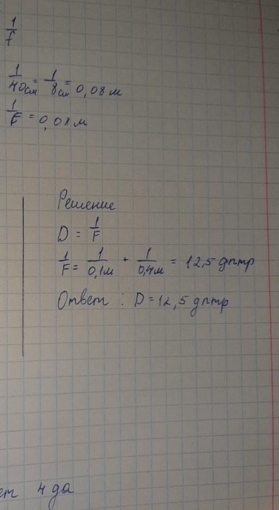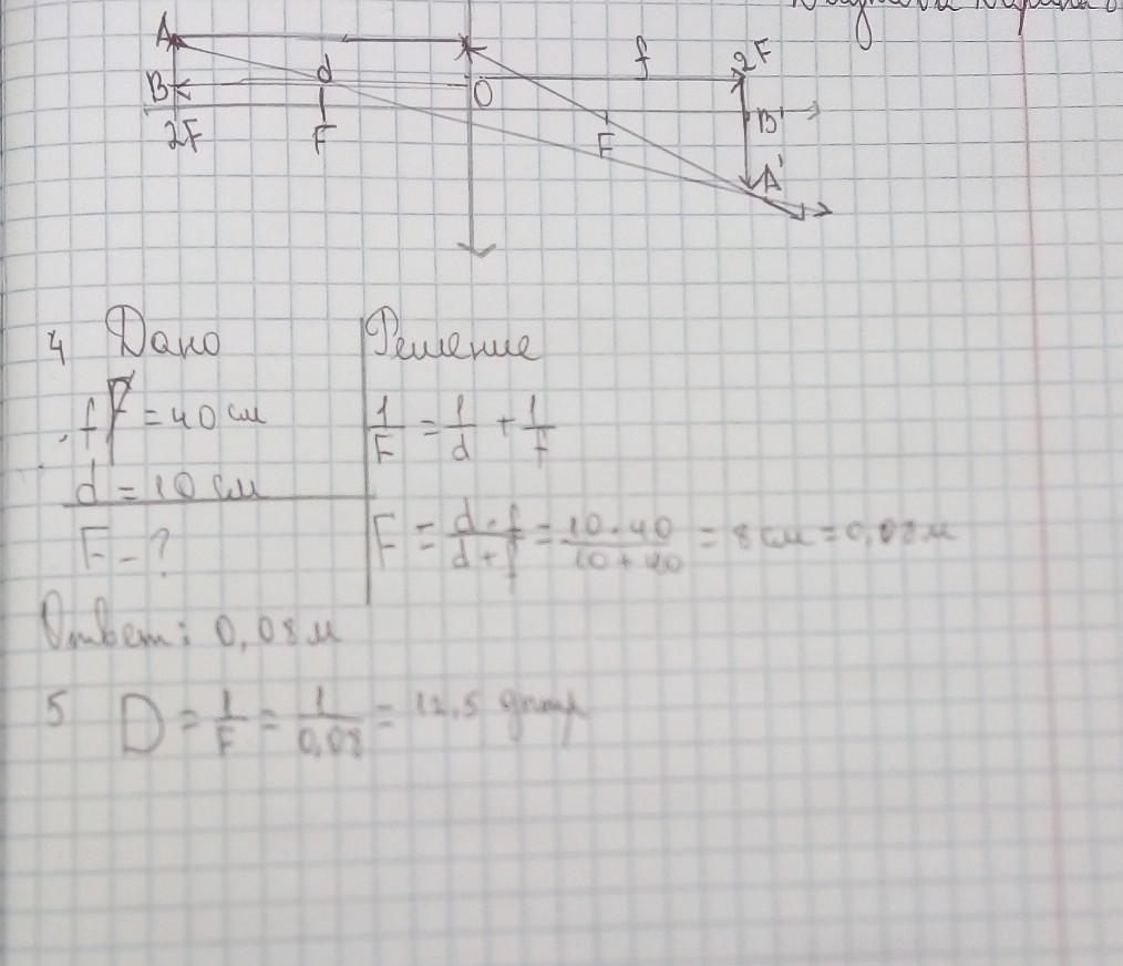 4)Если расстояние от собирающейся линзы до изображения 40 см, а расстояние от линзы до предмета 10 см, чему равна фокусное расстояние линзы?