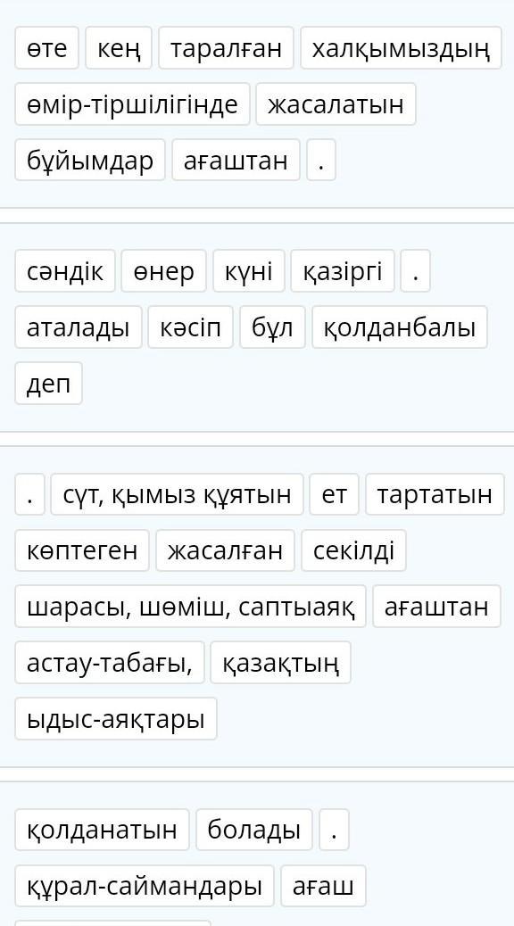 Қазақтың көптеген астау-табағы, сүт, қымыз құятын шарасы, шөміш, саптыаяқ секілді ыдыс-аяқтары ағаштан жасалған.
