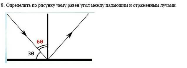 Определить по рисунку чему равен угол между падающим и отражённым лучами.