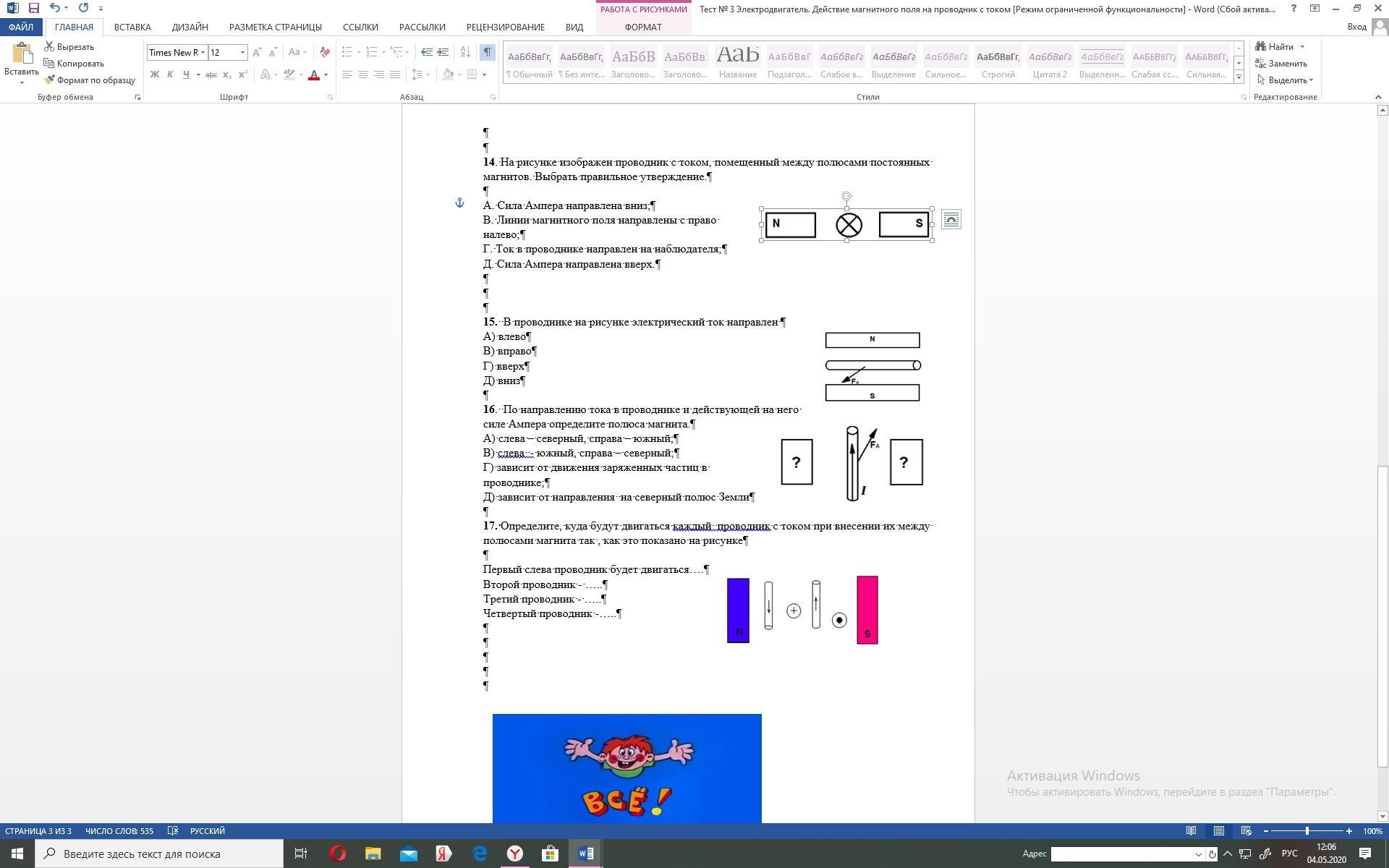 1.На рисунке изображен проводник с током, помещенный между полюсами постоянных магнитов. Выбрать правильное утверждение.