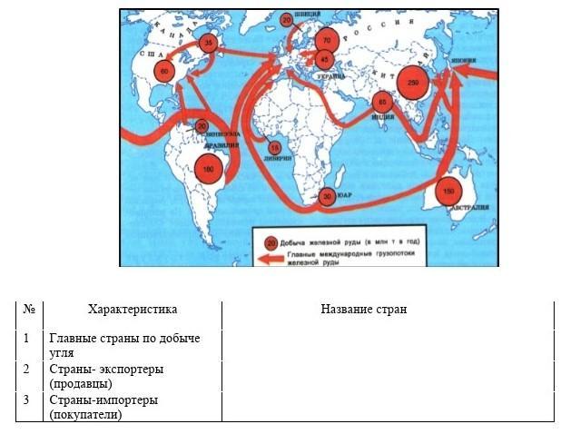 Изучите карту «Страны-экспортеры, страны-импортеры железной руды». Заполните таблицу, используя карту. Укажите не менее двух стран в каждой строк.
