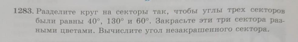 разделите круг на секторы так, чтобы быть всех секторов были равны 40° ,130°и 60° . закрасьте эти секторов разными цветами вычислите угол незакрашенного сектора. помогите пожалуйста