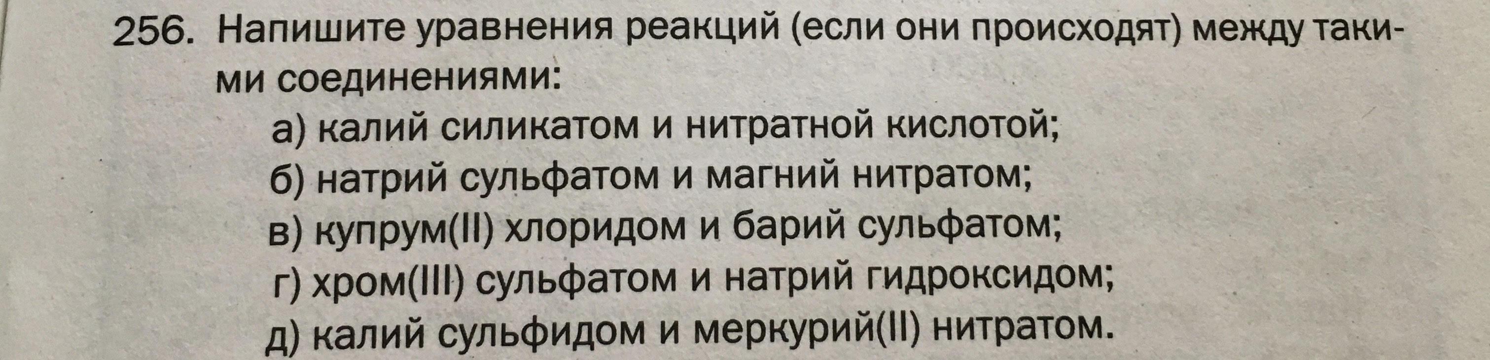 Б)Na2SO4 + Mg(NO3)2 = 2NaNO3 + MgSO4 в) CuCl2 + BaSO4 = реакция не идет, т.к. сульфат бария нерастворим. Г) Cr2(SO4)3 + 6NaOH = 2Cr(OH)3 осадок + 3Na2SO4 д) K2S + Hg(NO3)2 = 2KNO3 + HgS осадок