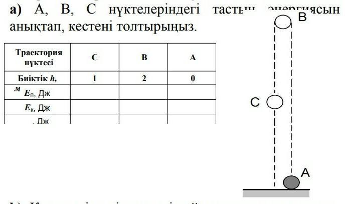 б)Определите энергию камня в точках A, B, C и заполните таблицу.