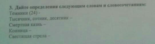 1Темник- военноначальник тумена. Тумен- военное формирование татаро-монгольского войска числом 10 тысяч. В русском языке получило название "темник" по аналогии с русским словом "тьма". 2воеводы обладающие отрядом в 1000 100 10 чел, остальное наверное знаешь