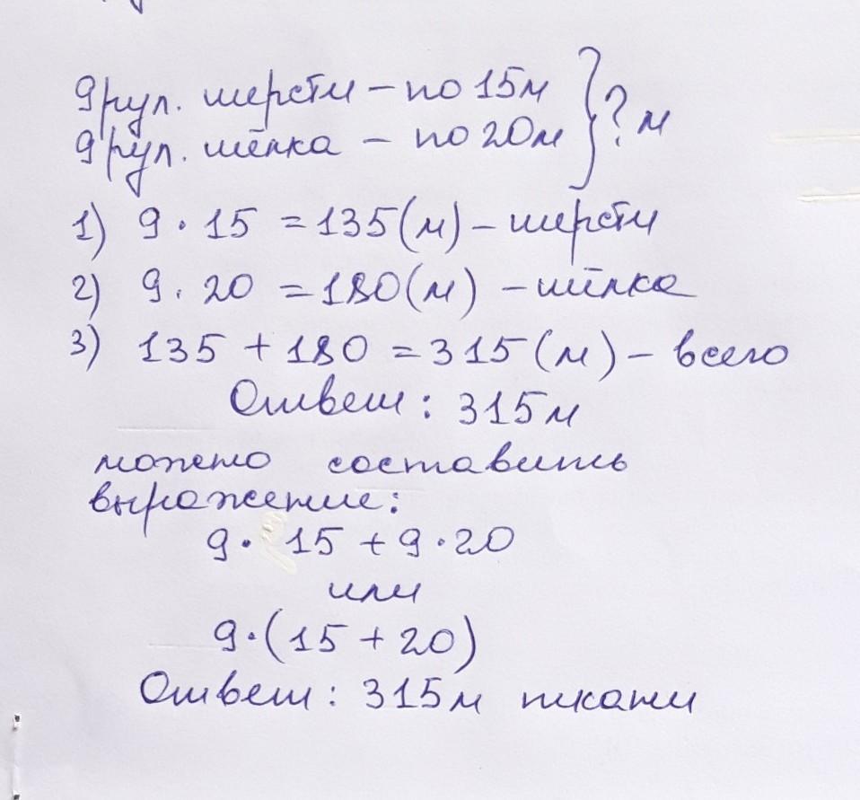 в магазин поступило 9 рулонов шерстяной ткани по 15 м в каждом столько же рулонов шёлковой ткани по 20 м в каждом рулоне сколько метров в ткани поступило в магазин? пжлст можете за 30 минут ответить