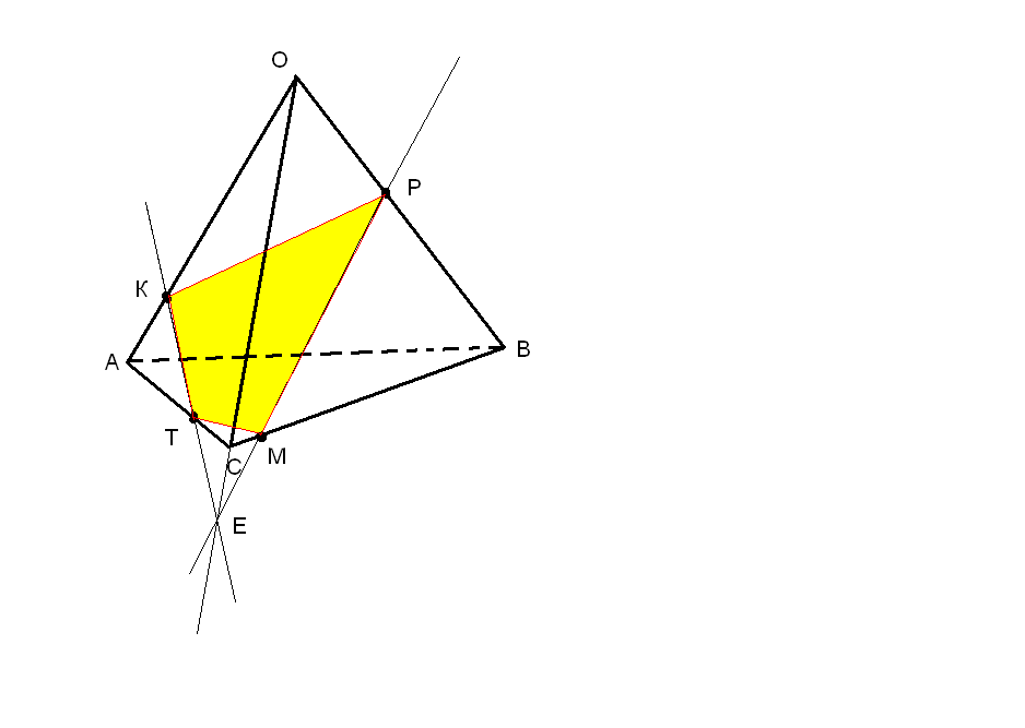 ОК - линия пересечения плоскостей АОС и ВОС. На этой прямой будет лежать общая точка, по которой плоскость сечения пересечет эти две плоскости. Поэтому продлеваешь кант ОС и проводишь прямую КТ, поскольку точки К и Т лежат в одной плоскости. Прямая КТ пересечет ОК в точке Е. Точки Е и Р лежат в одной плоскости ВОС, поэтому проводишь прямую ЕР. Она пересечет плоскость АВС в точке М. Точки М и Т лежат в одной плоскости АВС, поэтому соединяешь М и Т.