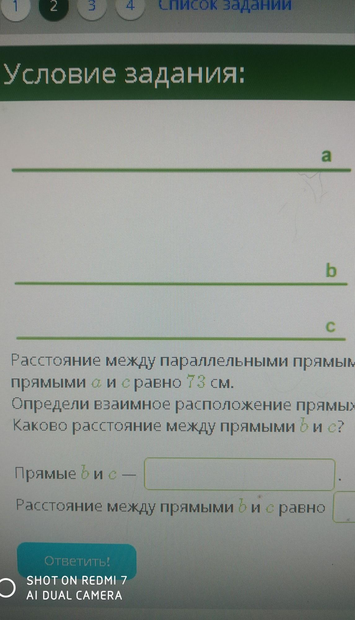 расстояние между параллельными прямыми а и b равно 18 см, а расстояние между параллельными прямыми a и c равно 73см.