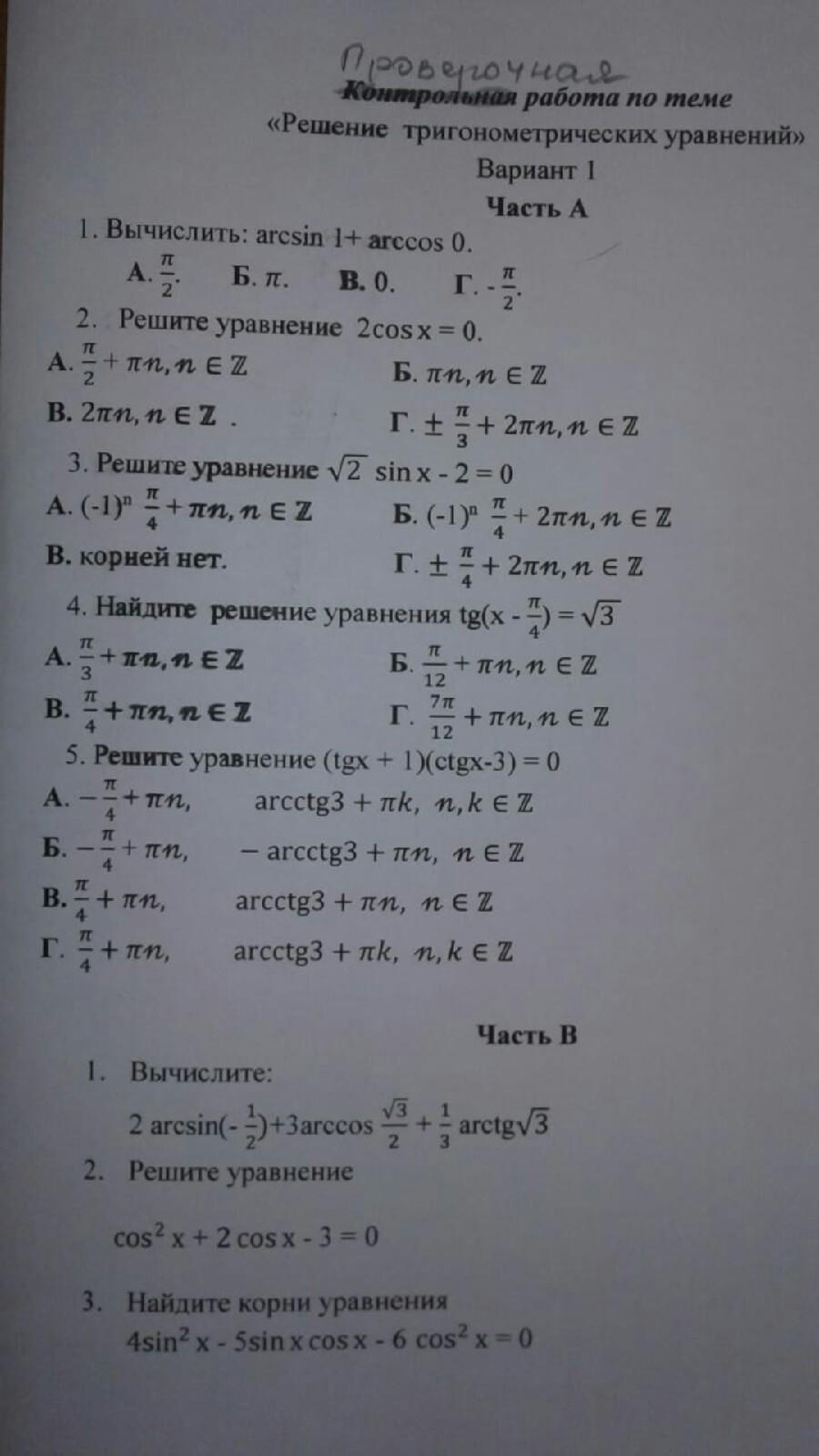 Помогите решить контрольную работу по теме "Тригонометрические уравнения"