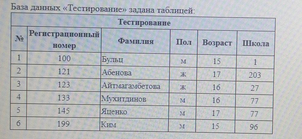 е) Определите, какие записи из таблицы "Тестирование" будут выведены в результате запроса по условию: Возраст>15 и Фамилия = *а