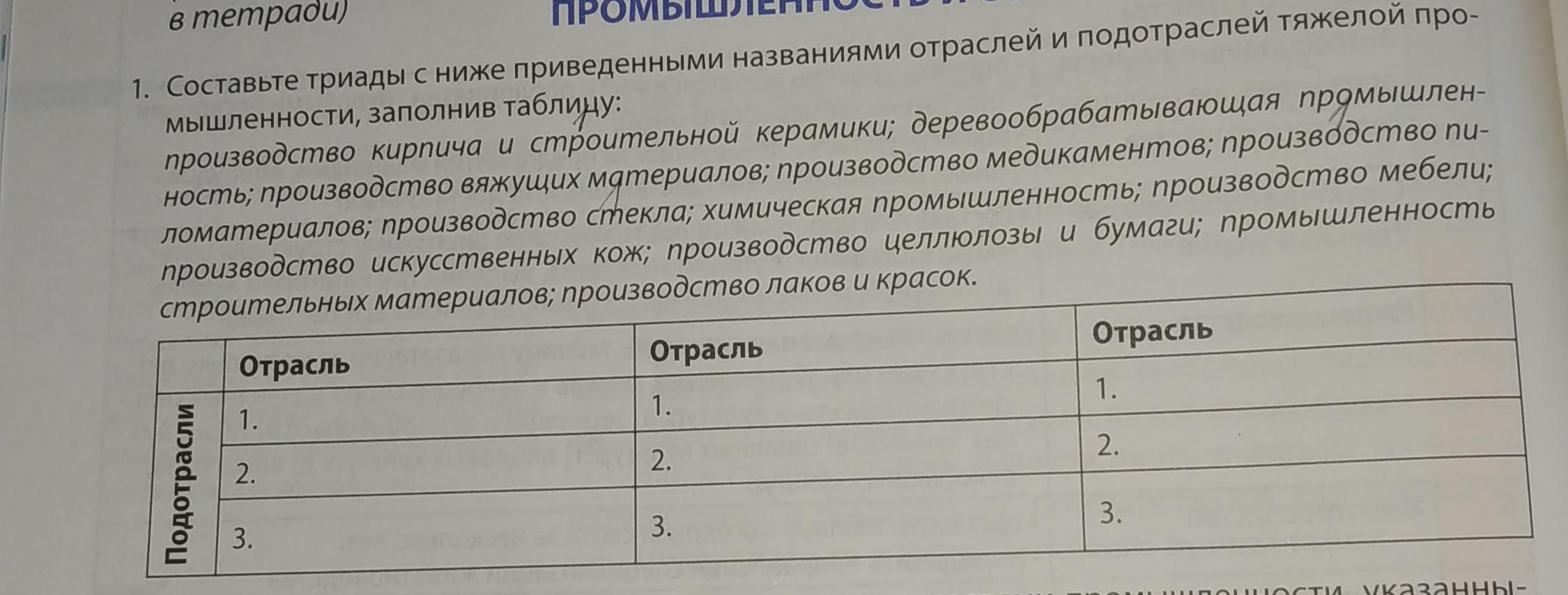 ПОМОГИТЕ Составьте триады с ниже приведеными названиями отраслей и подотраслей тяжёлой промышленности заполнив таблицу