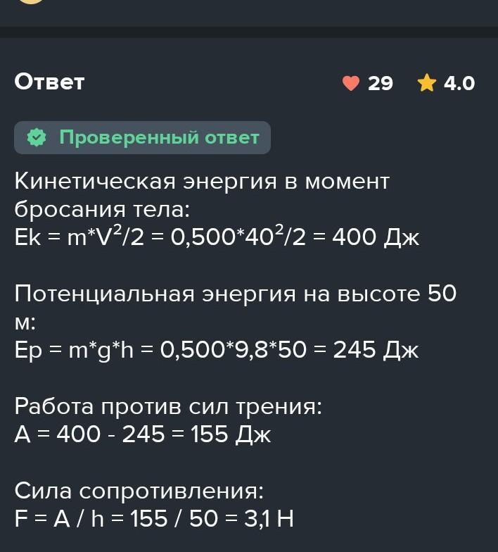 Тіло масою 500 г, кинуте вертикально вгору з початковою швидкістю 40 м/с, піднялося на висоту 50 м . Визначте силу опору повітря, вважаючи її піл час руху тіла незмінною.