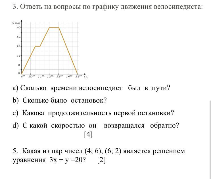 Пошаговое объяснение: d) за два часа он проехал обратно 40 км => V = S/t => V = 40/2= 20 км/ч
