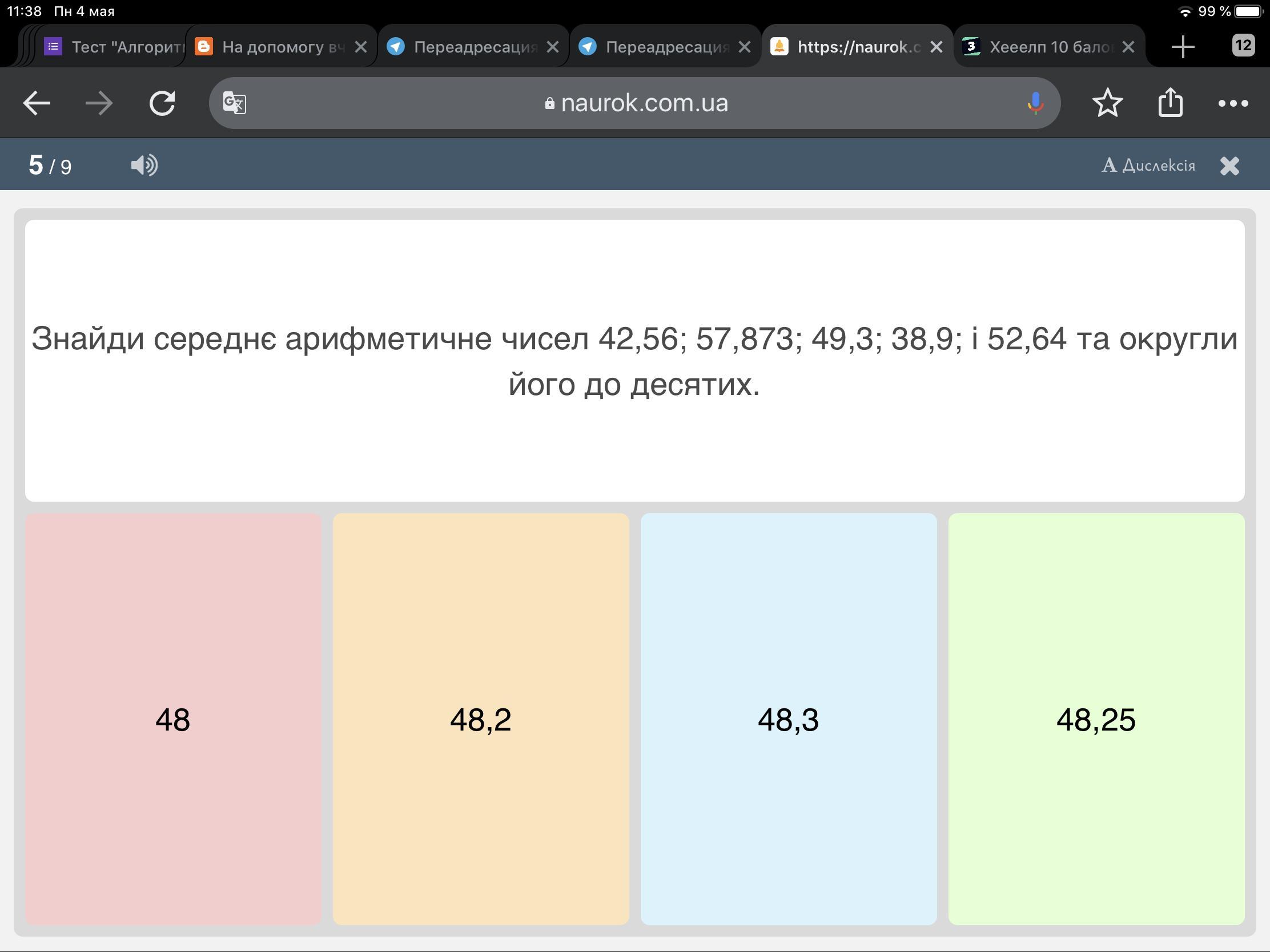4) 42,56+57,873+49,3+38,9+52,64= 241,273 ; 241,273÷5= 48,2546 , в десятих буде 48,2