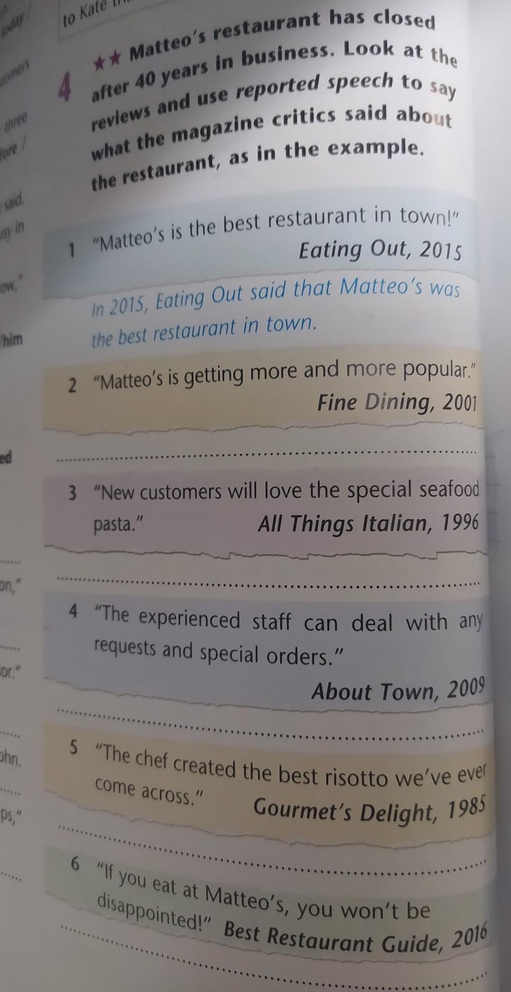 Matteos restaurant has closed after 40 years in business. Look at the reviews and use reported speech to say what the magazine critics said about the restaurant, as in the exampl