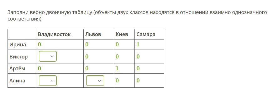 Заполни верно двоичную таблицу (объекты двух классов находятся в отношении взаимно однозначного соответствия).