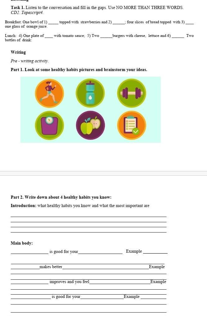 Task 1. Listen to the conversation and fill in the gaps. Use NO MORE THAN THREE WORDS CD2 Breakfast: One bowl of l) _ topped with strawberries and 2) one glass of orange juice. four slices of bread topped with 3) Lunch: 4) One plate of _ with tomato sauce: 5) Two _ burgers with cheese, lettuce and 6) bottles of drinks Two Writing Pre - activity. Part 1. Look at some healthy habits pictures and brainstorm your ideas. (помогите пожалуйста,также хочу попросить кто хорошо знает английский пожалуйста помогите со всеми заданиями
