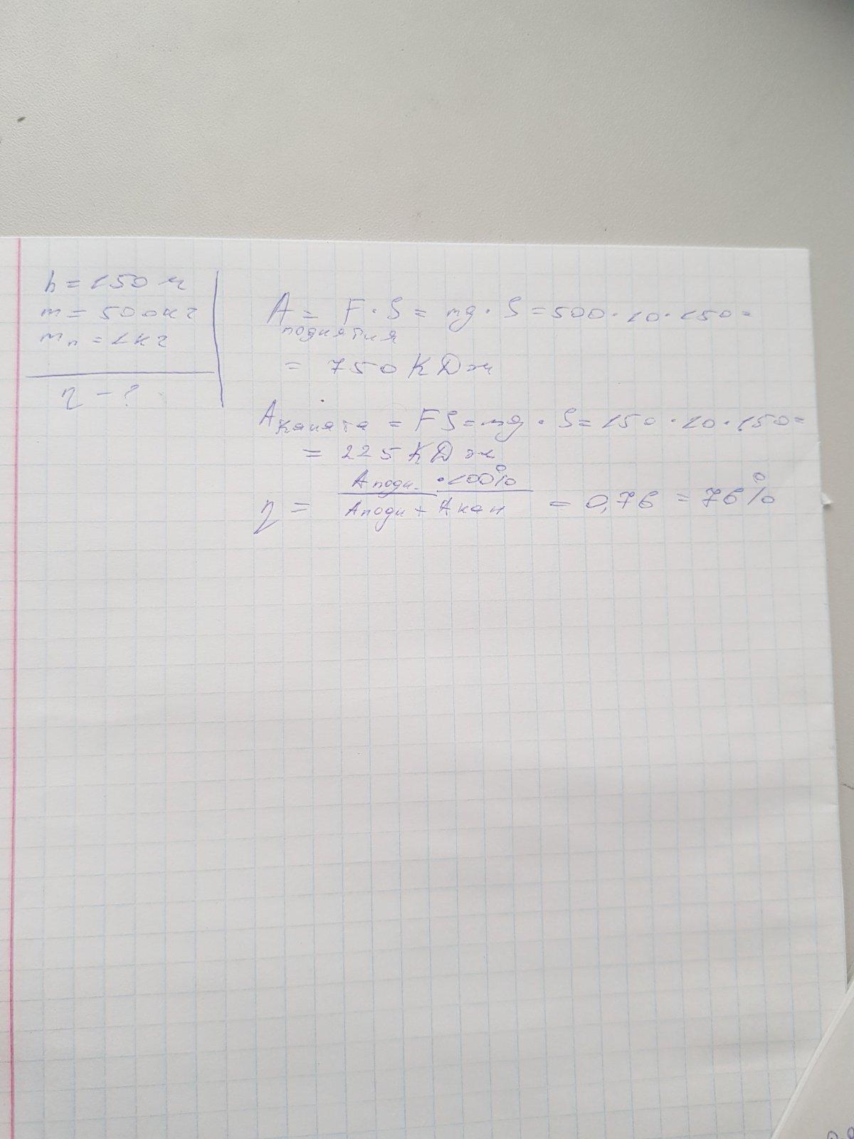 Із шахти завглибшки 150 м піднімають на канаті вантаж масою 500 кг.Маса кожного погонного метра становить 1 кг. Визначте ККД установки.