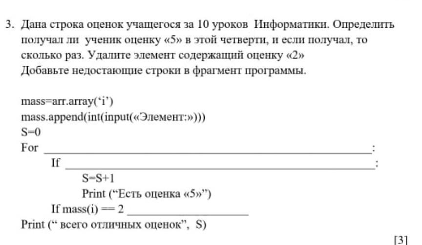Дана строка оценок учащегося за 10 уроков Информатики. Определить получал ученик оценку «» в этой четверти, и если получал, то сколько раз. Удалите здесь содержащий оценку «2» Добавьте недостающие строки в фрагмент программы