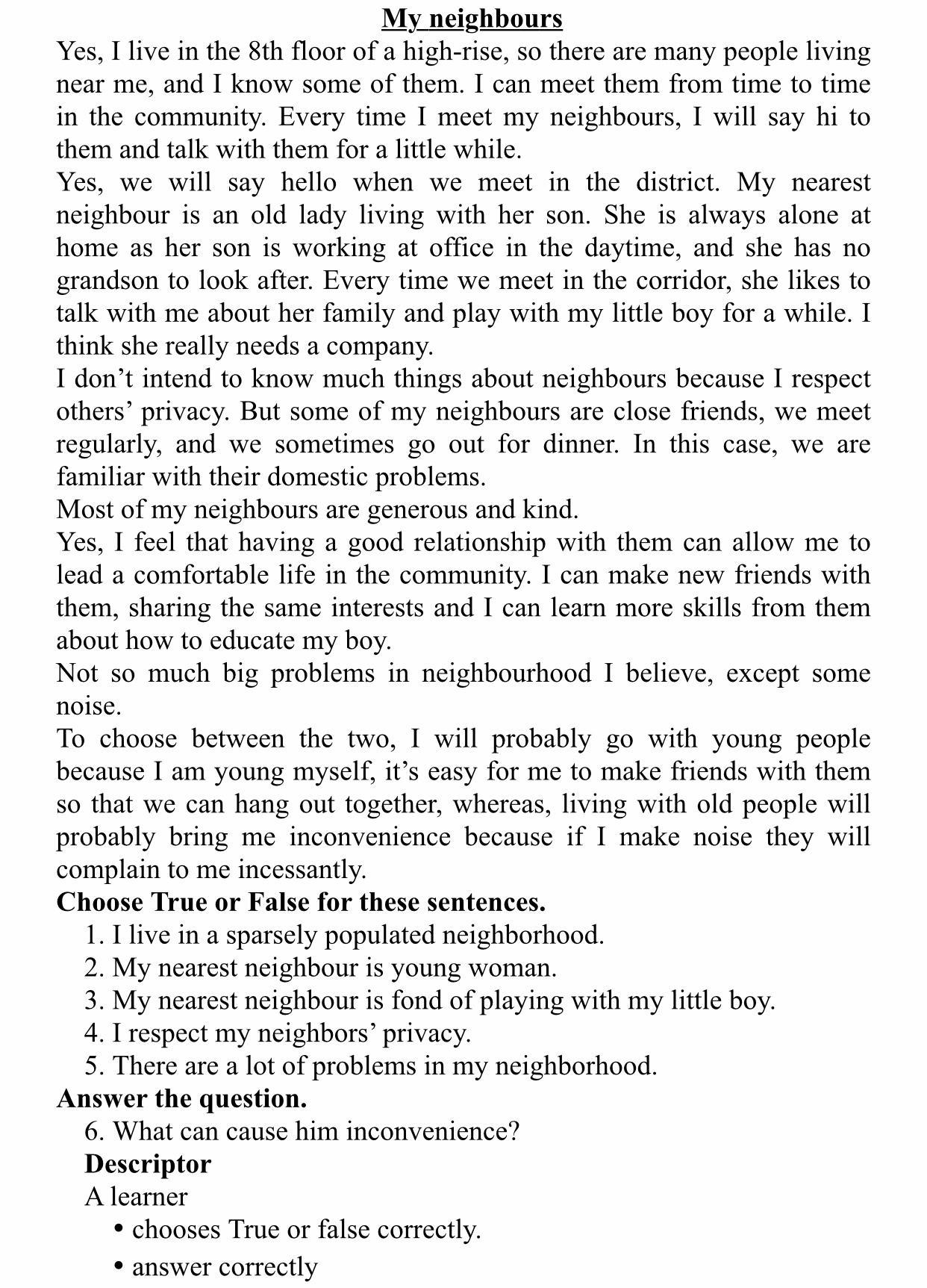 6. Living with old people will cause him inconvenience because if he makes noise they will complain to him incessantly. / Old people incessantly complaining to him about the noise he makes can cause him inconvenience.