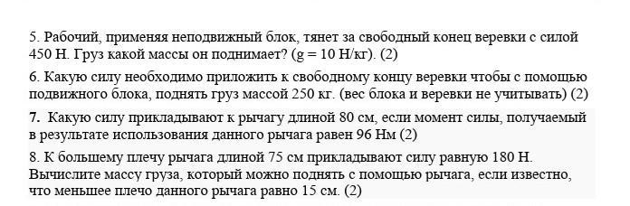5. неподвижный блок не дает выигрыша, значит F=P=450Н, m=F/g= 45 кг