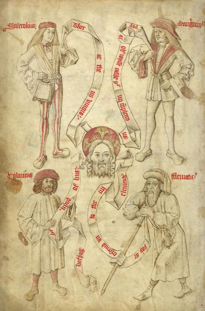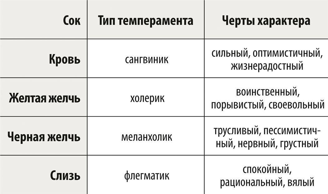 Пользуясь таблицей, отметь в пустых ячейках на картине, какой телесный сок преобладает в организме человека на иллюстрации.