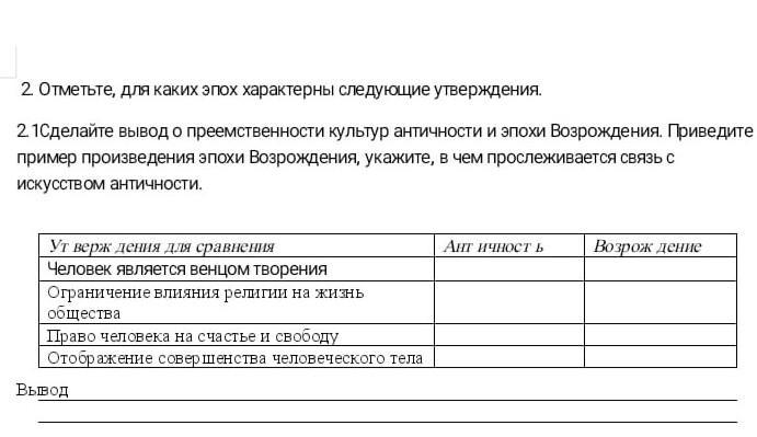 2.1Сделайте вывод о преемственности культур античности и эпохи Возрождения. Приведите пример произведения эпохи Возрождения, укажите, в чем прослеживается связь с искусством античности.