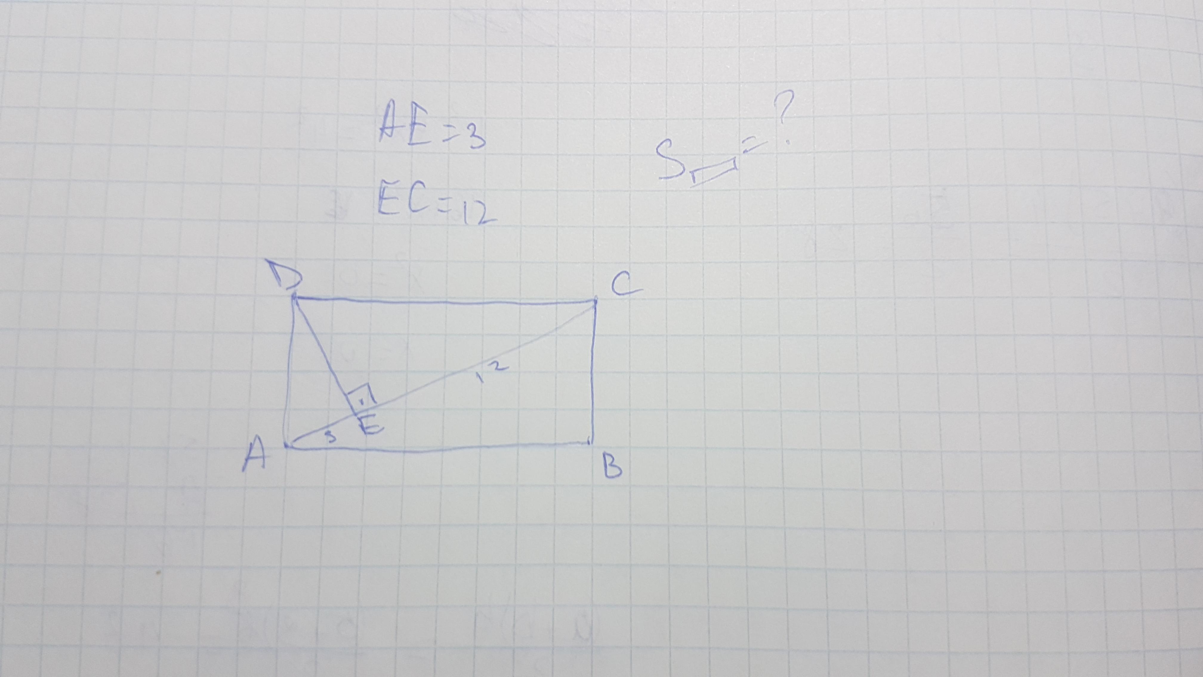 В прямоугольнике ABCD AE=3см и EC=12. Найти площадь прямоугольника.