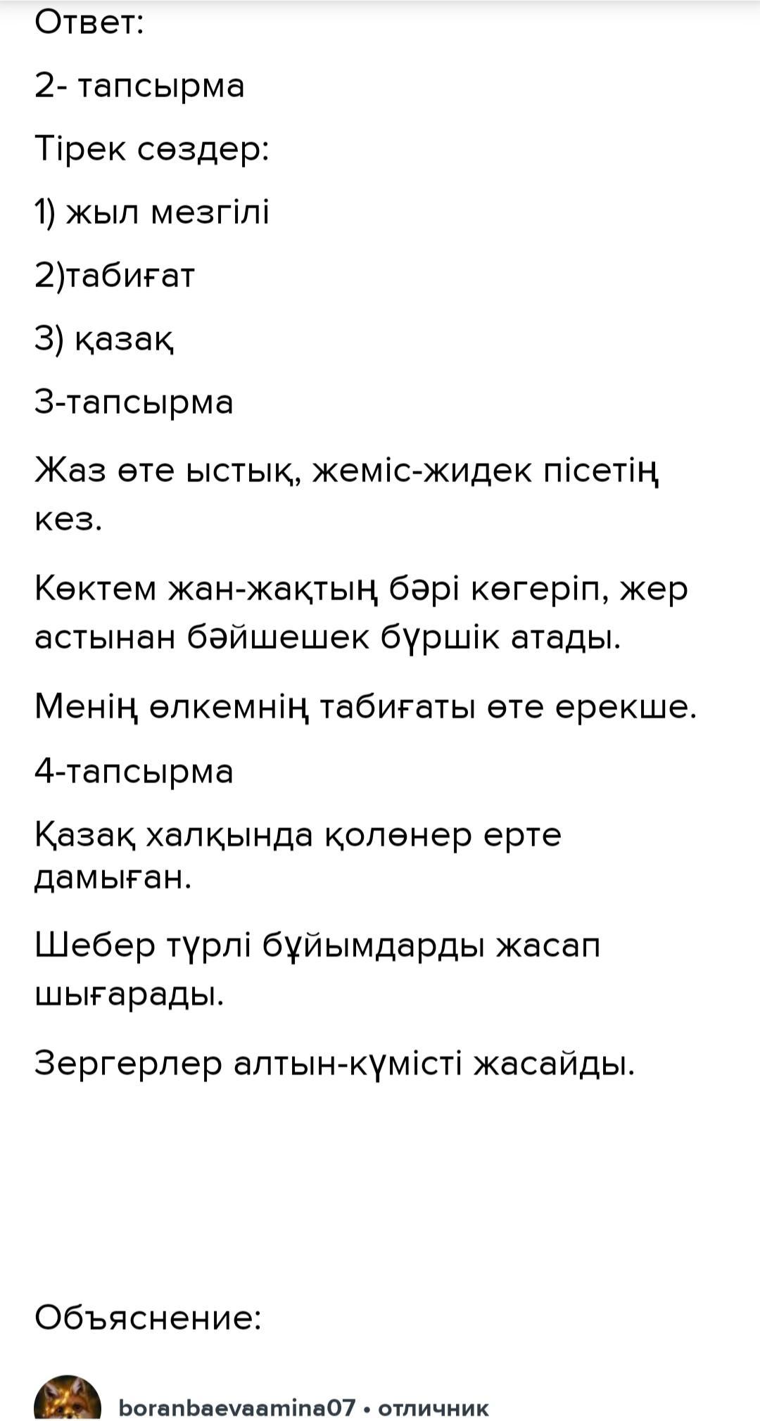 из текста надо найти 3 опорные слова:Біздің еліміздің табиғаты өте ерекше. Жыл мезгілінің қай тұсын алсаң да, я қаламыз, я ауылымыз жайнап тұрады. Қазір қыс мезгілін алсақ, терең тыныс алатын таза ауа, ақ көрпесін жамылған жер, екі беттері алмадай боп шана тепкен балалар. Ал, енді көктемге мезгіліне сипаттама берсек, жан-жақтың бәрі көгеріп, жер астынан бәйшешегіміз бүршік атып шығады. Жаз нағыз жеміс-жидектің пісіп, балалардың мәз-мейрам болатын уақыты. Күзге тоқталсақ, бұл жыл мезгілі әсіресе ақын аға-апаларымыз тілін түсіне білетін алтын уақыт. Иә, қалай дегенде де менің өлкемнің табиғаты тамаша, кең байтақ! Мен осы елде қазақ болып туылғаныма қуанамын!