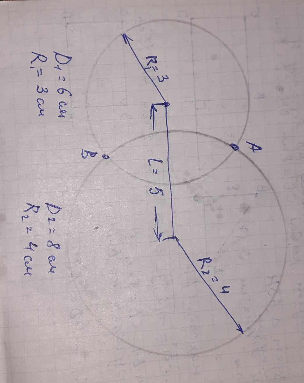 Екі шеңбердің арақашықтығы L=5см . Ал екі шеңбердің радиустар қосындысы R1+R2=3+4=7см