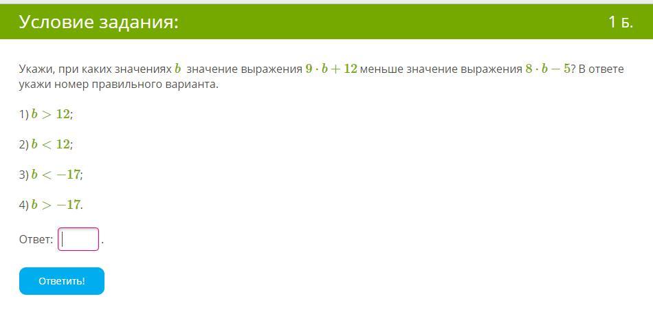 Укажи, при каких значениях b значение выражения 9⋅b+12 меньше значение выражения 8⋅b−5? В ответе укажи номер правильного варианта.