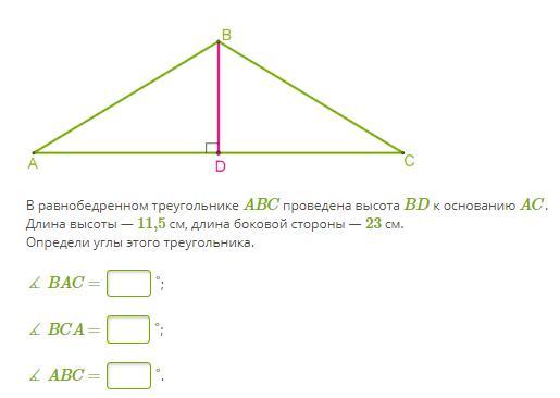 DB = 11,5 см, AB = BC = 23 см ⇒ ∠BAD(∠BAC) = ∠BCD(∠BCA) = 30°