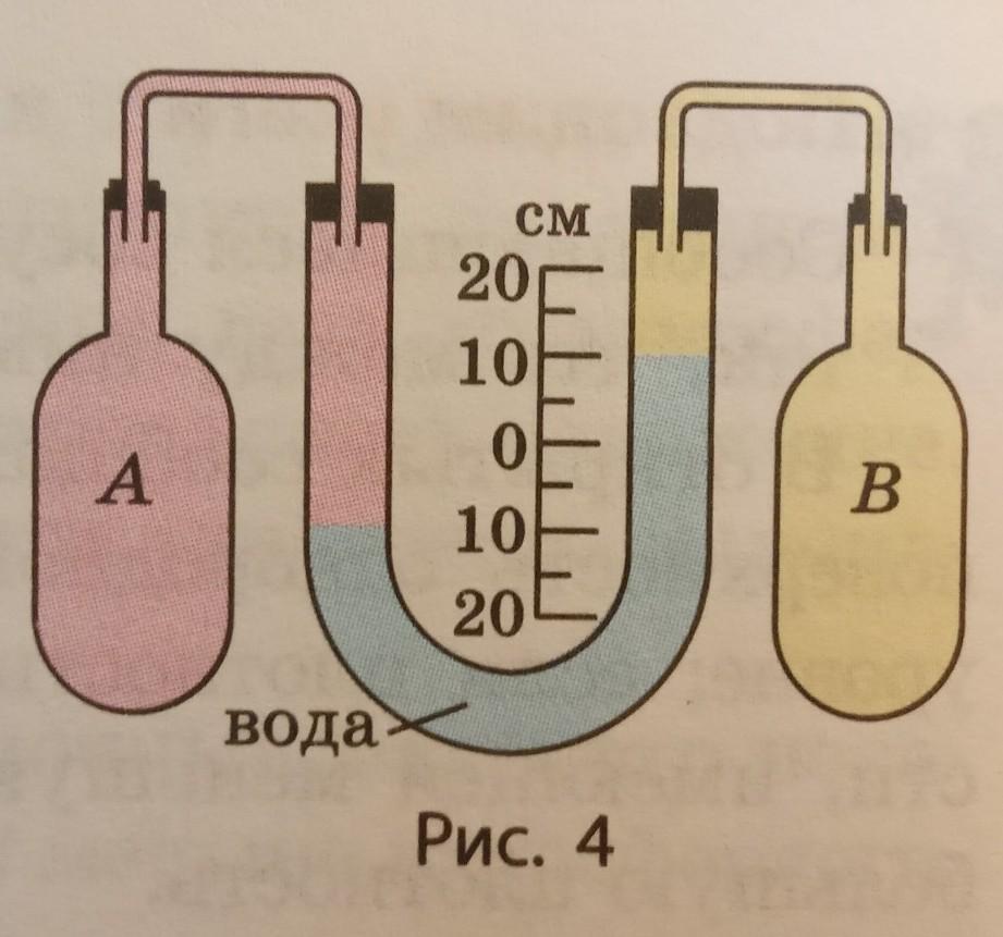 6. Определите давление газа в колбе В (рис. 4), если давление газа в колбе А равно 100 гПа.