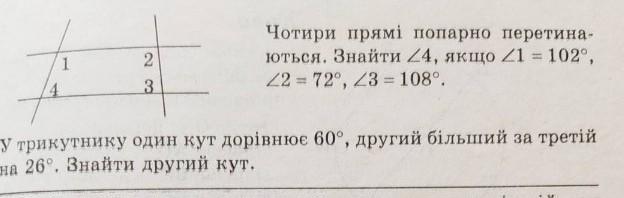 чотири прямі попарно перетинаються знайти кут чотири якщо кут 1 дорівнює 102 градуси кут 2 дорівнює 72 градуси кут три дорівнює 108 градусів.геометрія. будь ласка повне обяснення очень срочно!!!!?!