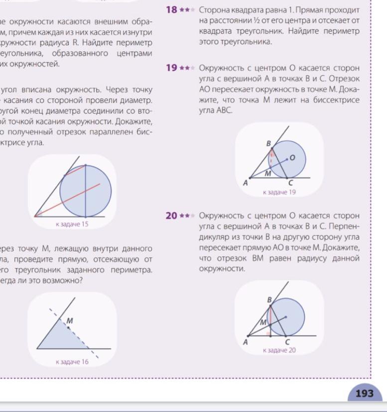 20) Окружность вписана в угол - центр лежит на биссектрисе.